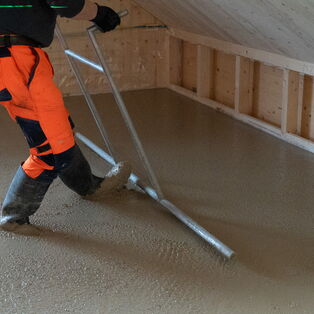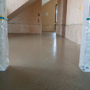 Auf rund 500 m² entsteht ein Terrazzoboden, der nicht nur ästhetisch überzeugt, sondern auch bauphysikalisch wirkt. Lehm speichert Wärme, reguliert die Feuchtigkeit und sorgt damit für ein angenehmes Raumklima. Im gesamten Gebäude werden alle Wohnräume mit dem KIBECO Cleancrete Nossim ausgeführt, lediglich Treppenhaus und Nasszellen bleiben ausgespart.
