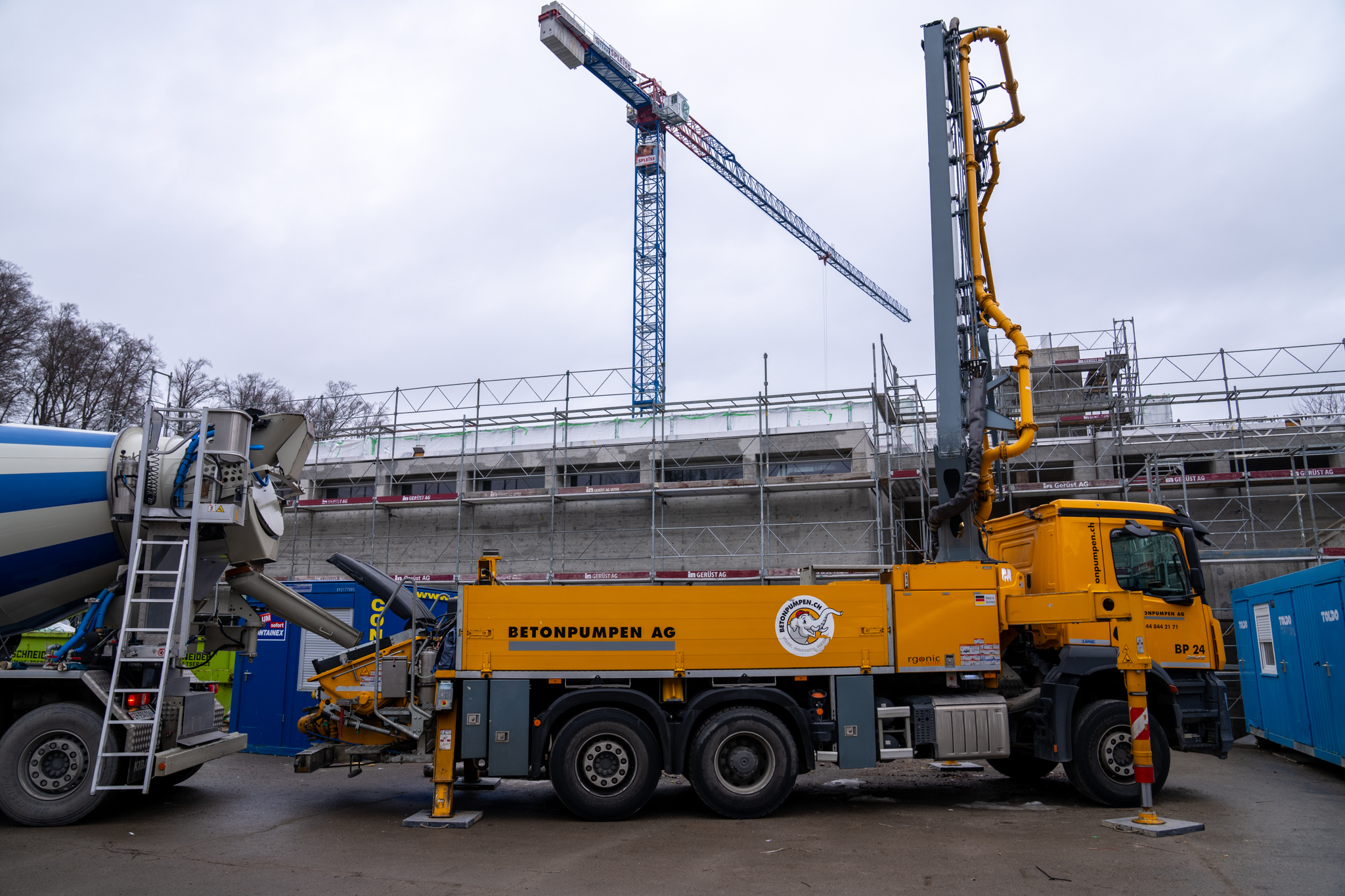 Work is currently being carried out on the Fohrbach swimming pool project in Zollikon using cement-free KIBECO Cleancrete Oulesse. In collaboration with Spleiss AG and Betonpumpen AG, the easily compactable cement-free concrete is being pumped over 100 meters and then used as fill concrete in the swimming pool.